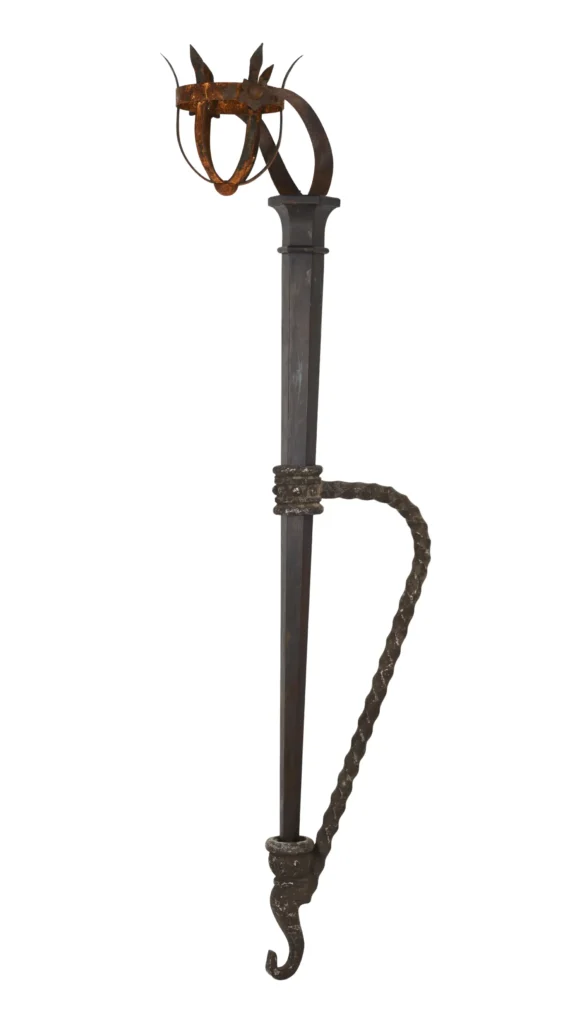 On December 10, 2025, Julien’s Auctions held their Hollywood Legends and Classic Hollywood sale. One of the standout items in this sale was a torch, used in the filming of the movie. It was a wall torch consisting of four pieces, including an original metal wall bracket in a pattern resembling scrolls, a long wooden pole, a U-shaped bracket, and a metal basket with prongs to hold a flame. The torches feature in scenes of the Wicked Witch’s castle. Indeed, she lights her broom to attack “Scarecrow” from the flame of one of the torches, and that is when Dorothy kills her by throwing a bucket of water, which kills the witch.